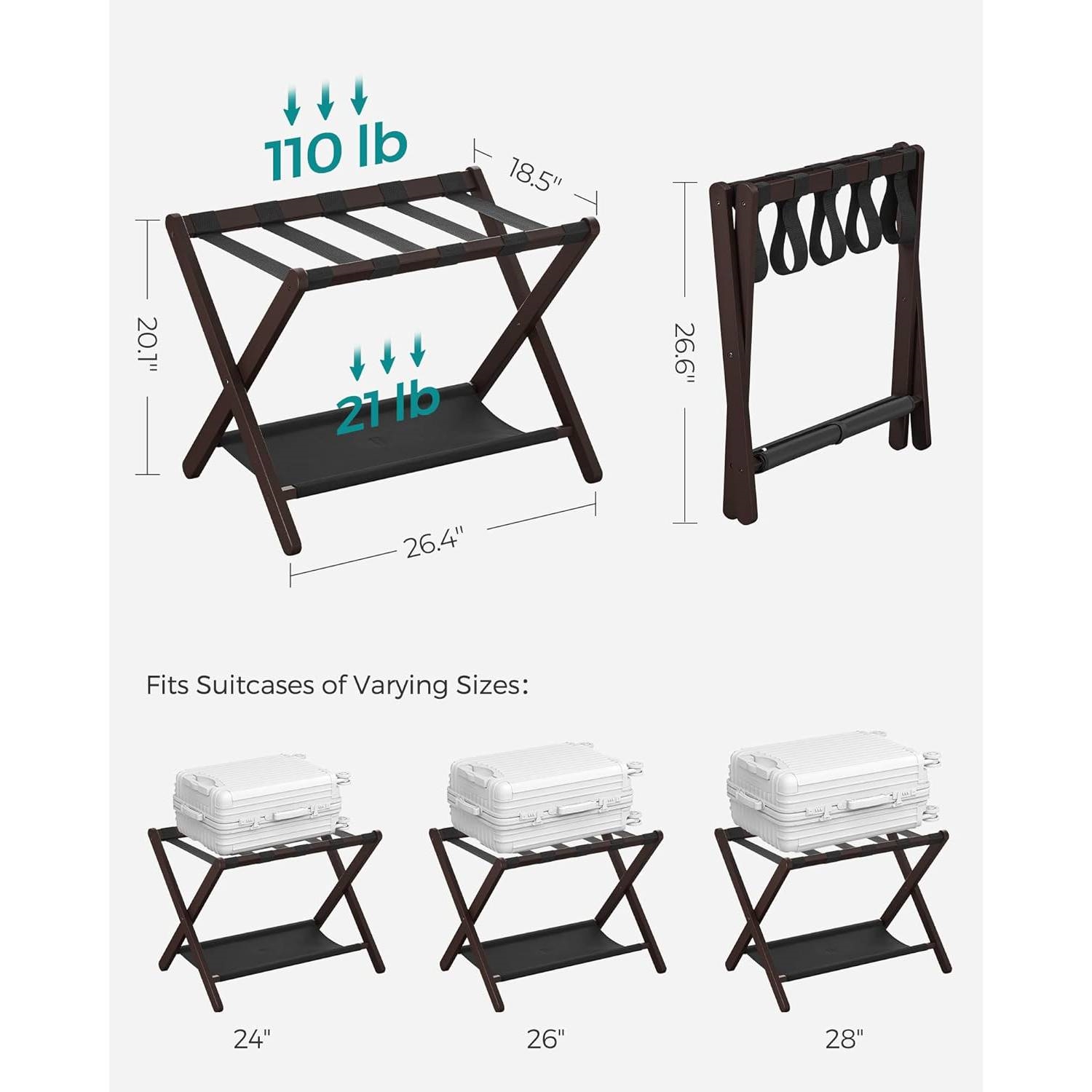 Make your guests feel at home with this Set of 2 - Sturdy Bamboo Luggage Rack in Brown Wood Finish with Bottom Shelf. It elevates their suitcase to a comfortable height for packing and unpacking, saving you or your guests from bending down to the floor. The natural bamboo frame combined with robust nylon straps supports up to 110 lb on the top and 21 lb on the lower shelf; the espresso finish adds a personal touch to bedrooms, guest rooms, or hotels. This 26.4”D x 18.5”W x 20.1”H (67 x 47 x 51.1 cm) luggage rack, that’s wider than similar ones, can hold 24”, 26”, or 28” suitcases. It folds to a 26.4”D x 3.2”W x 26.6”H (67 x 8.1 x 67.6 cm) size for easy storage in closets or corners. Follow the instructions to connect the 4 corners of the structure with the included Allen key and only one type of screw so you can easily set up this suitcase stand. No more getting lost in nuts and bolts! The lower storage shelf of this luggage rack keeps shoes or other items off the floor; the hook-and-loop fastener on it lets you roll up the fabric layer to keep it neat and clean when folded.