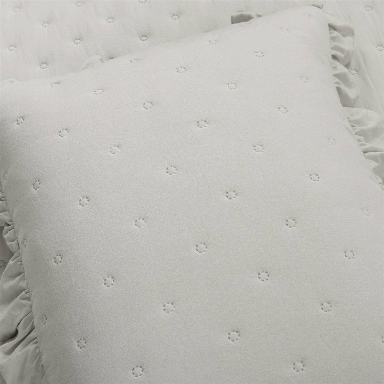 This Full/Queen Lightweight Grey Ruffle Reversible Oversized 3 Piece Quilt Set has cozy cottage style with a chic flair. Soft crinkled fabric and quilted tufting create an unmatched texture you'll love to cozy up in. Airy ruffles edge the quilt and two matching shams, giving a feminine touch. The lightweight poly fill ensures all season comfort. Add this delightful Ruffle Reversible Oversized 3 Piece Quilt Set to your primary, guest, or teen's bedroom to complete your charming personal style. The quilted detailing across the fabric adds dimension and extra comfort. You'll love the ruffled edges that give this set extra pizazz. This Ruffle Reversible Oversized 3 Piece Quilt Set includes a soft and luxurious quilt and two matching pillow shams. The pillow shams also have the ruffled edges!