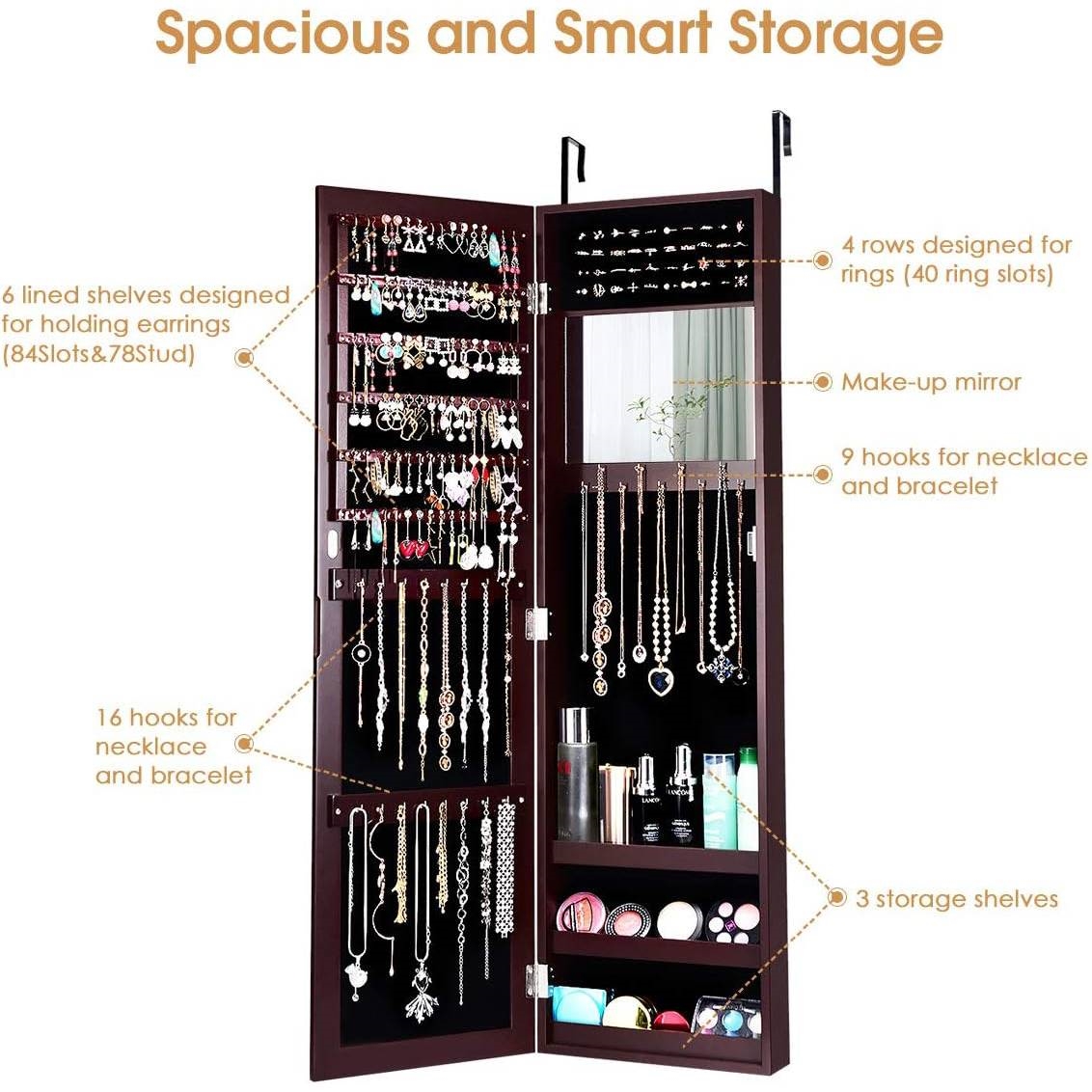 This 2-in-1 Dark Brown Wall or Door Mounted Jewelry Organizer Full Length Mirror can be both wall mounted and door mounted and the height is also adjustable as your needs. No matter which mounting you choose, it can save much space for you. The mounting height is adjustable. This 2-in-1 Dark Brown Wall or Door Mounted Jewelry Organizer Full Length Mirror includes 6 lined shelves for holding earrings (84 earring slots & 78 earring holes), 25 hooks for necklace and bracelet, 4 rows of 40 ring slots, 3 storage shelves and an inside makeup mirror. It has a super smart inside space to keep all your jewelry organized and neatly displayed. This jewelry cabinet is simple in shape and uses the MDF as main frame material. The frame is thick and with a certain strength. Our MDF boards are specially customized. They are not ordinary materials in the market. Our coating is very smooth and looks very textured and you will be happy to receive it. This jewelry cabinet is a combination of a full-length mirror and a jewelry cabinet. It can be used as a mirror for you to dress. It can also be used as a practical jewelry cabinet to store your daily jewelry, giving you a clean and spacious space.