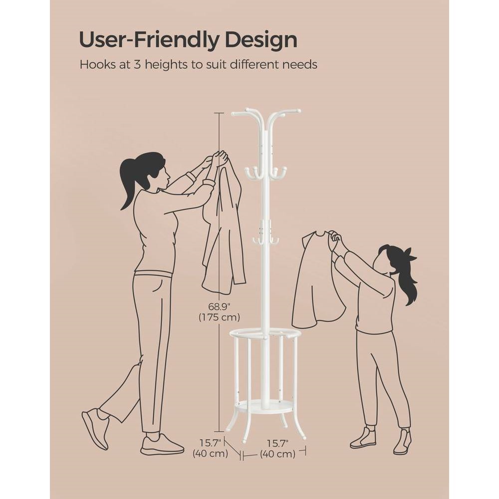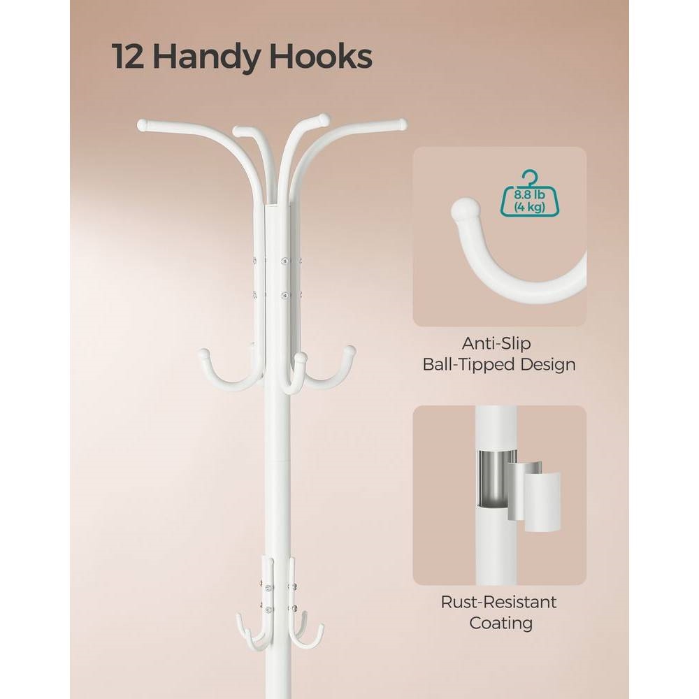 With 4 sturdy legs and a low, stable center of gravity, this Heavy Duty White Metal Coat Rack with Umbrella Holder allows you to confidently hang heavier coats and bags on 12 robust hooks (each hook holds up to 8.8 lb), ensuring your items stay securely in place. Featuring 12 ball-tipped hooks, this coat rack stand protects your clothes from damage while also preventing them from slipping off. The 4 ball-shaped adjustable feet of this coat rack freestanding provide extra stability, ensuring that it remains balanced even on slightly uneven floors. Equipped with an umbrella stand with a cut-out section, this coat rack is perfect for storing both long and folding umbrellas, while the drip tray protects your floors from rainwater. Crafted from robust metal with a rust-resistant coating, this coat rack with umbrella holder is built to last, making it a perfect addition to your hallway, living room, bedroom, and more.