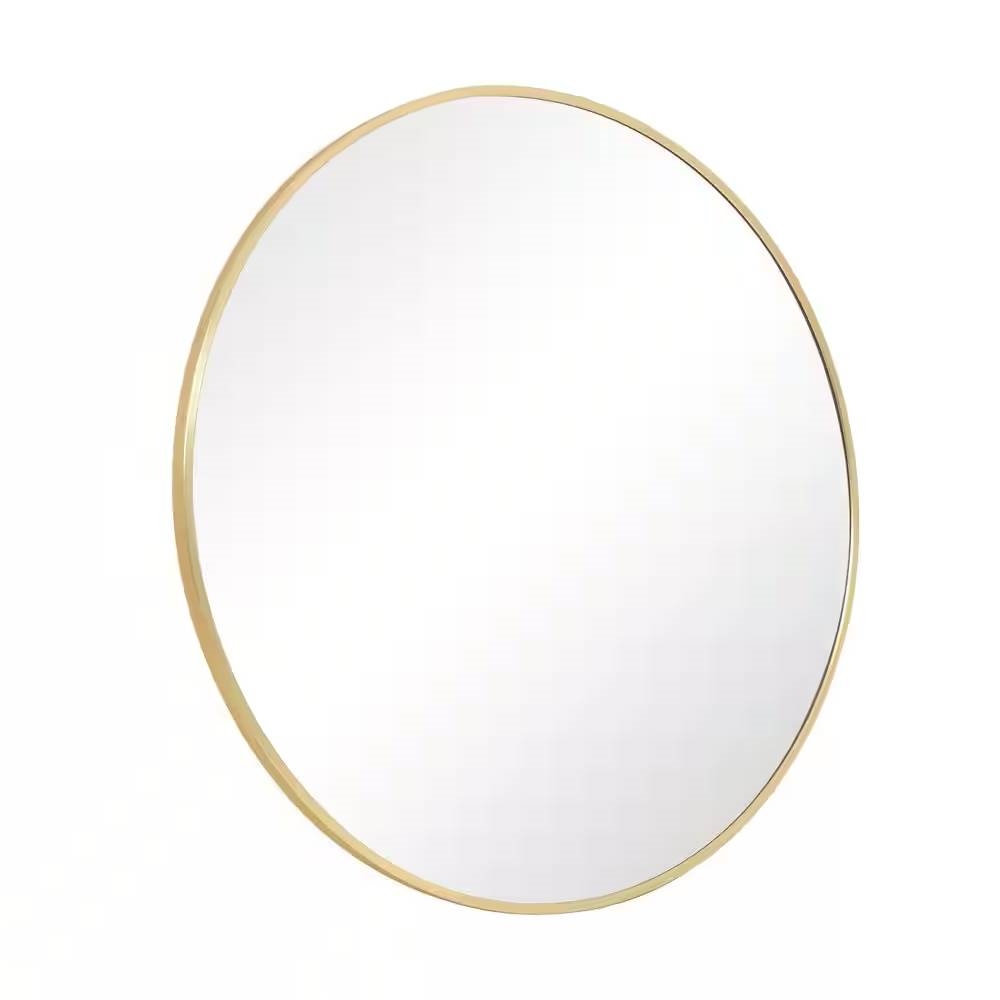 The Round 30-inch Circular Bathroom Wall Mirror with Gold Frame brings a blend of modernity and elegance to your walls. Its sleek gold metal frame not only adds style but also creates depth and dimension within your space. With its substantial size and minimalist design, this wall mirror is perfect for amplifying both natural and artificial light, thus illuminating various areas like bedrooms, bathrooms, hallways, entryways, living rooms, and offices. The mirror is inset within the frame, enhancing the overall sense of depth and dimension in your surroundings. It arrives at your doorstep with enhanced packaging, ensuring a safe delivery without damage. Crafted with a medium density fiberboard backing, this mirror reduces the likelihood of warping that can be associated with solid wood backings. This choice of material also enhances stability, offering a reassuring durability. For your convenience, this mirror, despite its size, is impressively lightweight. It arrives ready to adorn your wall straight out of the box, complete with the necessary mounting hardware.