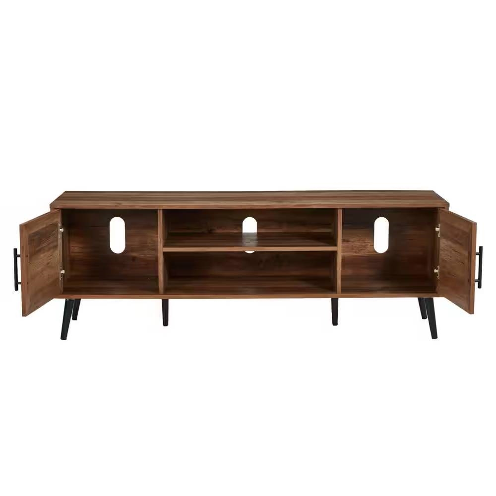 This Modern Rustic Wood Finish TV Stand with Mid-Century Legs - for TV up to 65-inch lets you display decorations, TVs, plants, and more while keeping your home organized and stylish; Comes in a mid-century modern look. Side cabinets with handled doors add extra storage space for your remote controls, media devices, DVDs, and gaming accessories, keeping your entertainment center tidy. Comes with a cut-out cable hole at the back of the shelves to conveniently organize your device cables discreetly, maintaining a clutter-free entertainment area. With middle open shelving, allowing you to store decor, cable boxes, books, plants, and collectibles, all while enhancing the aesthetics of your room. Ideal for use with TVs up to 65 inches across or 150 pounds; Overall dimensions (L x W x H): 59.06 x 15.56 x 20.87 inches, providing ample storage and display space.