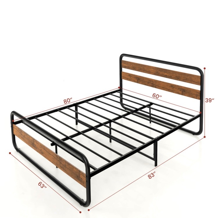 Rustic wood grains meets simple black metal making this Queen Size Rustic Arc Tube Head/Footboard Platform Bed Frame an attractive must have in any FarmHouse bedroom. Bed frame is 13 inches off the ground, which offers large space for storage of shoes, bed sheets, etc. Features arc corners to avoid hurtful collisions and comes with preinstalled EVA pads for less frictions between the slats and frame. Holds 660 lbs. and works best with an 8-12 inch standard queen size mattress.