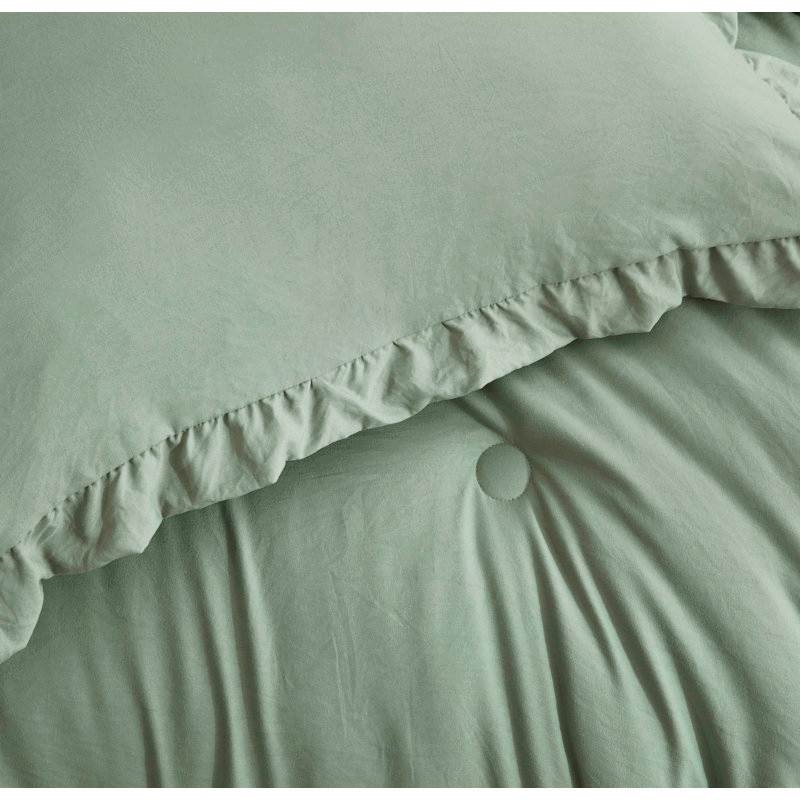 Transform your bedroom in a sophisticated and luxurious manner with this King Oversized Sage Stone Washed Ruffled Edge Microfiber Comforter Set. An attractive ruffled edge trim with an elegant yet simple presentation that makes you feel right at home. Fashionably providing everyday comfort. Lightweight, high loft comforter with adequate warmth for year-round use. The comforter is made of 100% microfiber polyester, giving a super soft smooth, and cozy feel. The fabric is stone-washed which creates a natural attractive crinkled fabric effect to enhance the aesthetics of the comforter.