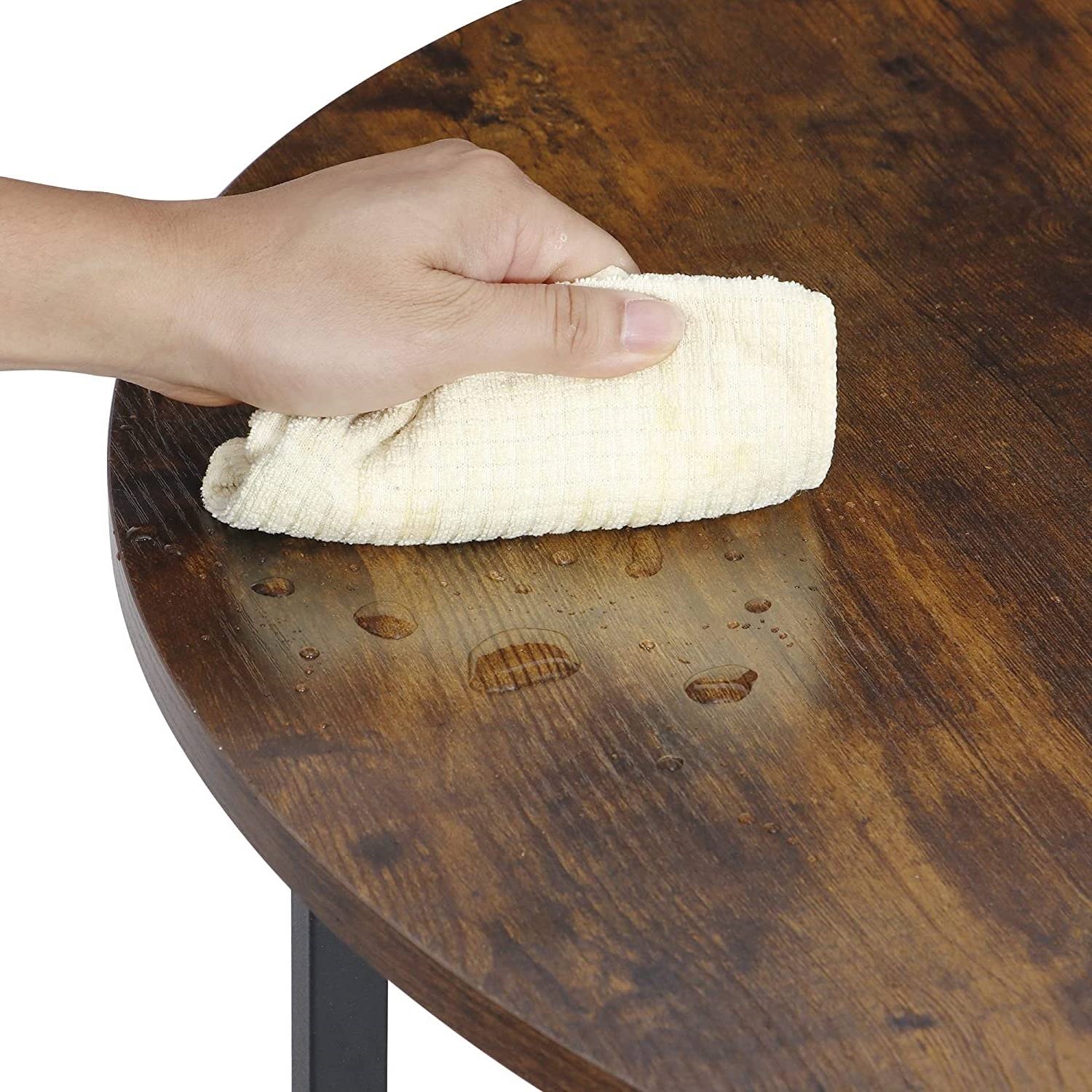 Constructed with durable MDF wood top and thick metal frame, this Modern Round Industrial Coffee Table with Rustic Brown Wood Top boasts its stability and good load-bearing capacity (The desktop can support 130 pounds). Compared with particle board, MDF is more scratch-resistant and has better skid resistance and texture touch, which will complete the look of your living room and promises a long service life.