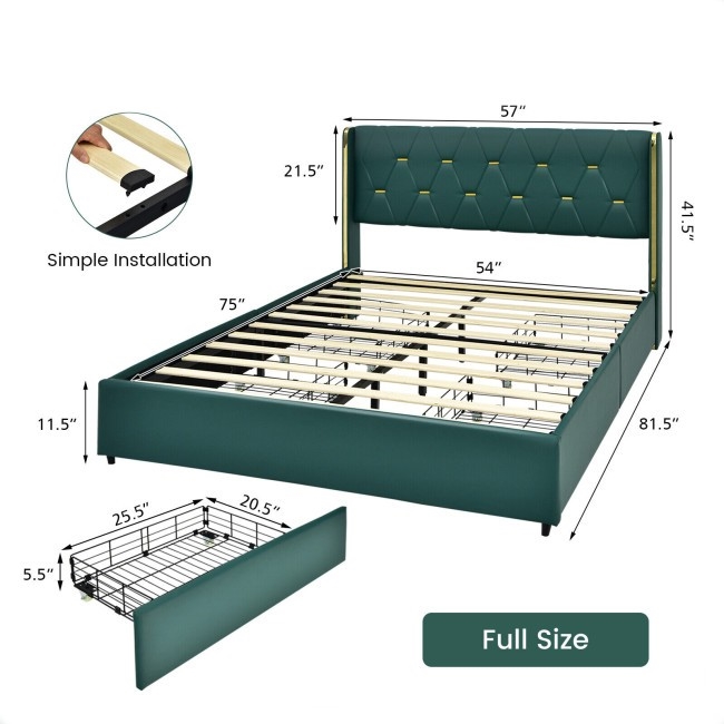 This Full Size Green/Gold Linen Headboard 4 Drawer Storage Platform Bed is designed with 4 large drawers to accommodate your pillows, bed sheets, seasonal clothes and more. Crafted of high-density sponge and breathable linen fabric. The steel construction is sturdy enough to withstand a 660 lbs weight. With a tufted headboard, the bed frame looks very lavish and elegant, which definitely brings a sense of fashion to your bedroom. More, its installation is very simple. Each slat can be firmly installed by a hand pressing.