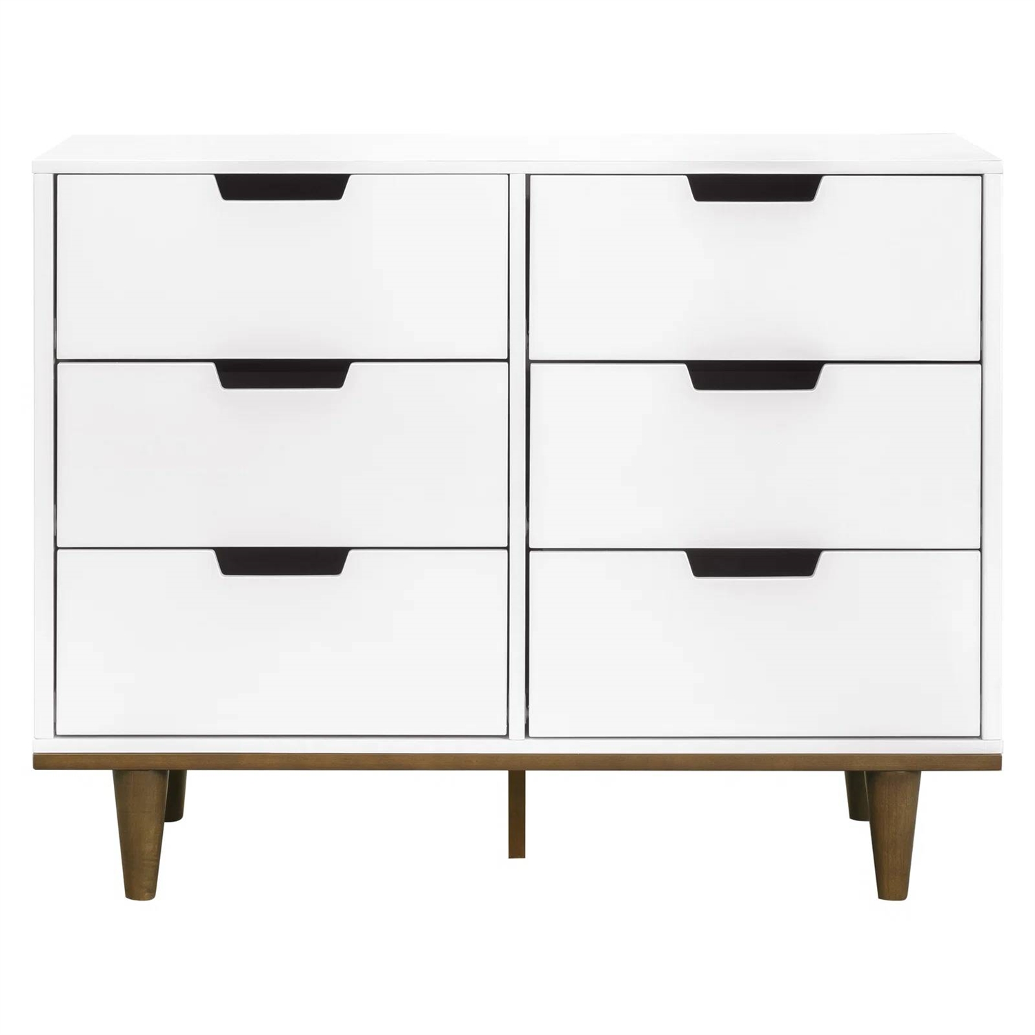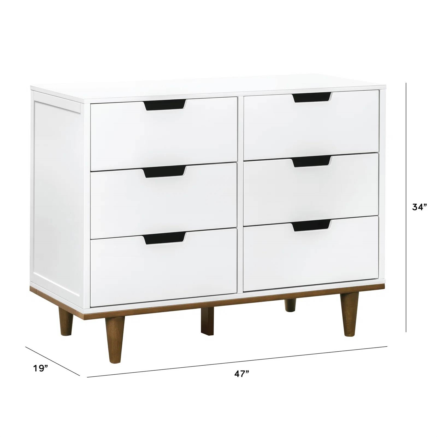 This Modern Mid-Century Style 6-Drawer Double Dresser in White Walnut Wood Finish features six spacious drawers with open finger pulls and a versatile, modern look. 6 spacious drawers that can hold all the adorable baby clothes, blankets, and more. Sturdy enough to last you through the years. Changing stations now. Big kid dresser later! This dresser is designed so that you can add a changing tray (#M0619) to use as a convenient changing station during the baby years. Euro drawer glides make opening the drawers easy even when your hands are full with your baby. We've done the hardest part for you! Drawer glides come pre-assembled so that you can put your dresser together more quickly and start enjoying your nursery sooner. Made of solid sustainable New Zealand pinewood and TSCA compliant engineered wood -only the best for your baby. Say goodbye to toxic chemicals! This dresser is lead and phthalate safe. Rest assured knowing it meets or exceeds ASTM International and U.S. CPSC safety standards. Stop mechanism and anti-tip kit included for additional safety. We've done the hardest part for you! Drawer glides come pre-assembled so that you can put your dresser together more quickly and start enjoying your nursery sooner.