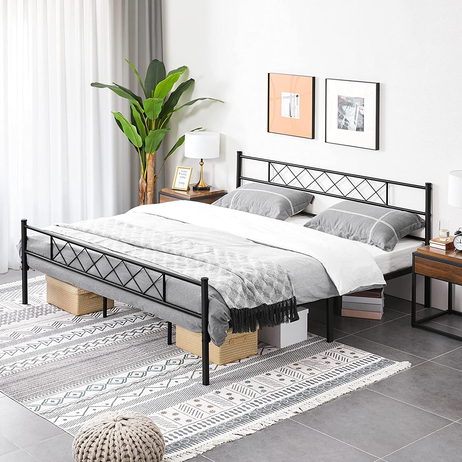With simple lines and an open design, this King Size Traditional Powder Coated Slatted Metal Platform Bed with the cross-design headboard and footboard is a great addition to any home! The slatted base combined with a polished finish creates a strong industrial tone suitable for any/all industrial, rustic and farmhouse decors. Crafted with sturdy metal slats, side rails and 6 solid legs, this frame base is capable of holding up to 838lb. Cleaning is a breeze, simply wipe clean with a damp cloth and a mild cleaner. This bed has 11.2 inches of clearance under the bed for extra storage space. Assembly required and ships via FedEx Ground.