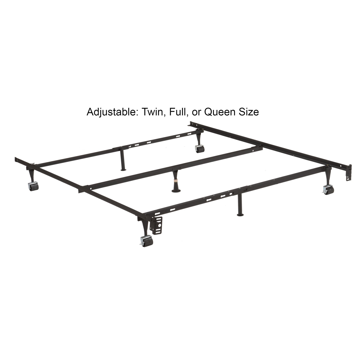 Set a simplistic foundation for your restful retreat with this understated Twin, Full, Queen Sturdy Black Metal Adjustable Bed Frame w/Headboard Brackets. An essential for any master suite, bedroom, or guest room. Crafted from 1 1/4 inch steel with a black finish, this sturdy frame offers an expandable design that can be adjusted to fit any box spring/ mattress sizes from twin, full, or queen. Comes with a center support rail, 4 wheels, and 3 support legs. make it a durable support system to hold up any box spring and mattress. All tools are included and assembly shouldn't take more than 10 minutes.