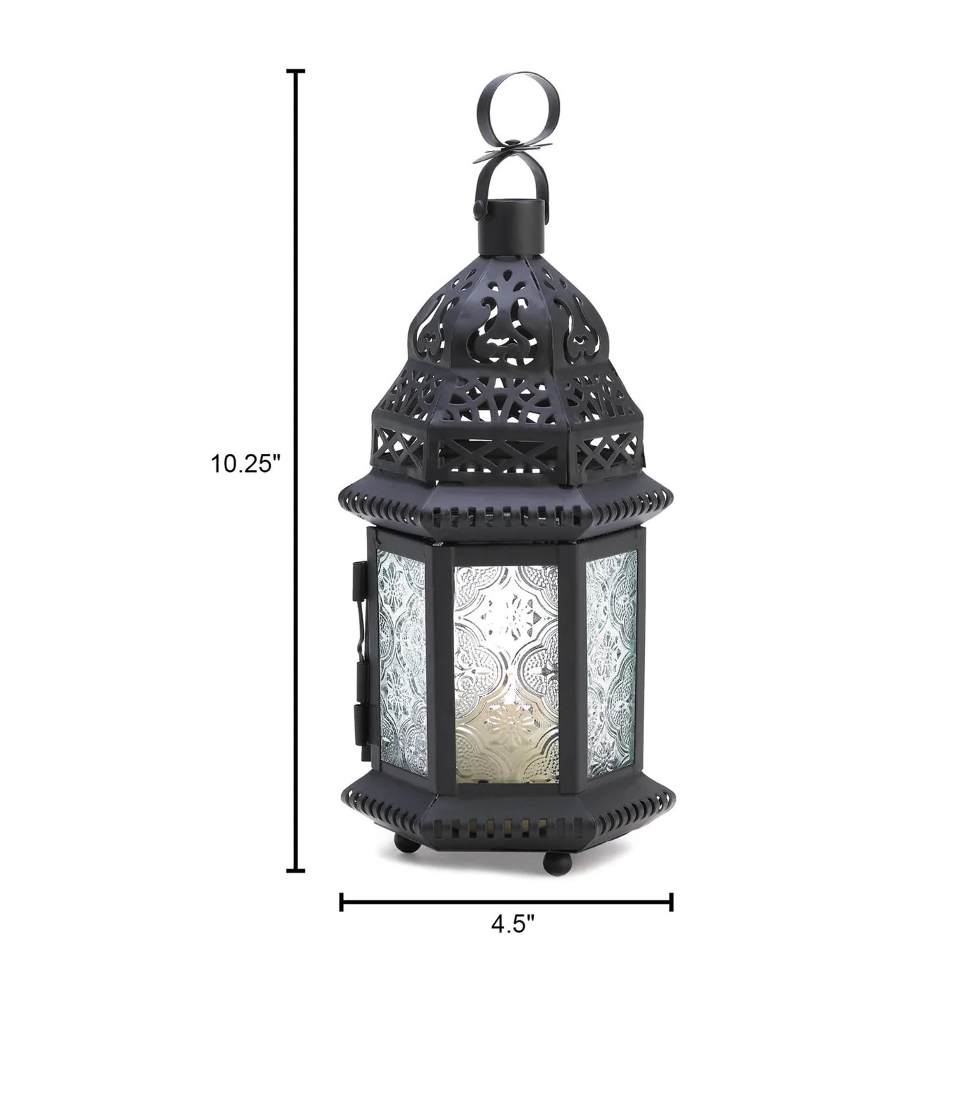 • The lantern weighs 0.7 lbs. and measures 4.5 inches by 3.75 inches by 10.25 inches. Making it perfect for either hanging outside or as a table centerpiece.