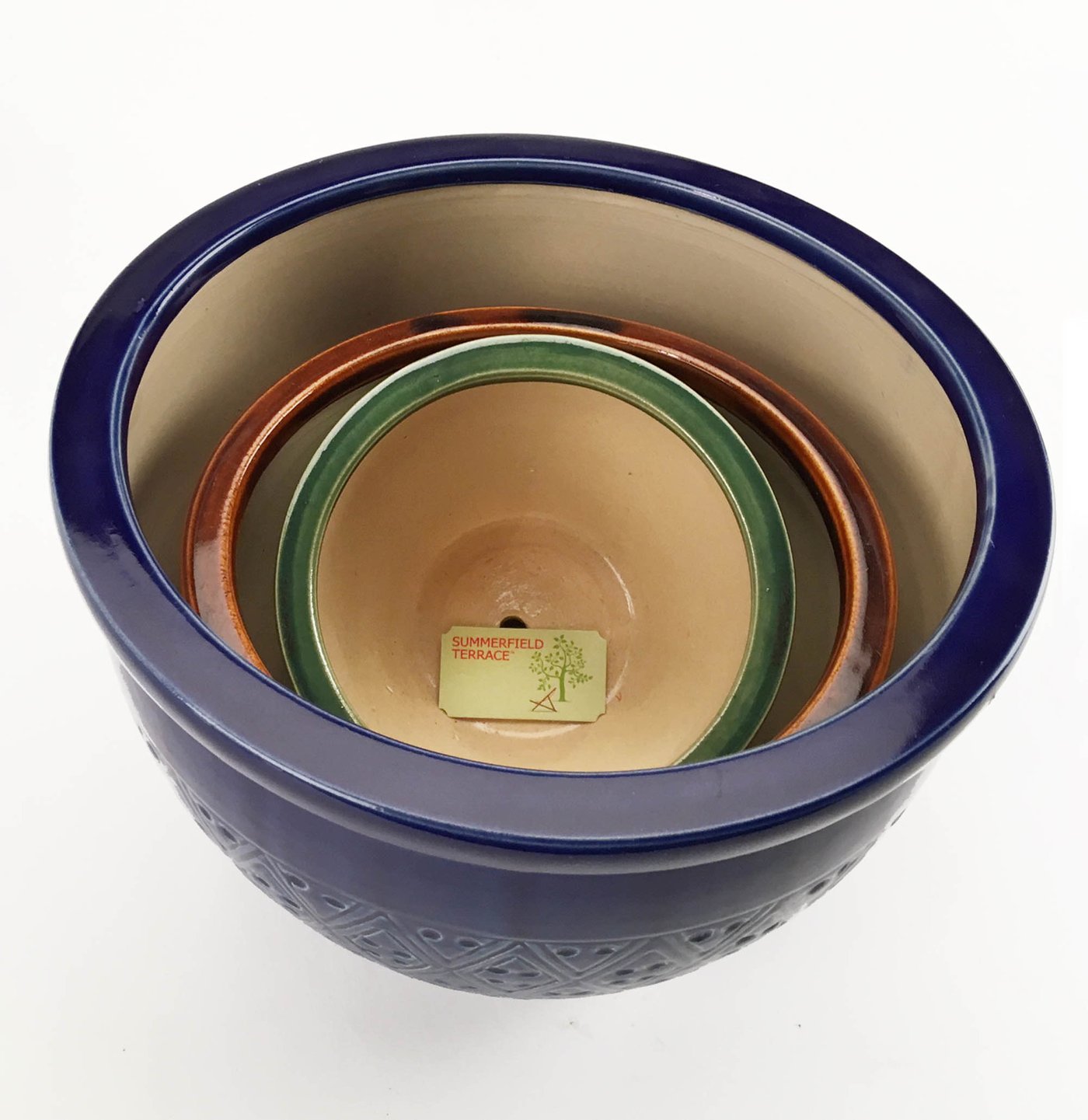 • Bring a burst of color to your garden! Embossed earthenware flower pots are sumptuous in shades of azure, topaz and peridot. Set includes three separate sizes to hold a variety of your favorite greenery! Drain hole at bottom of each pot.