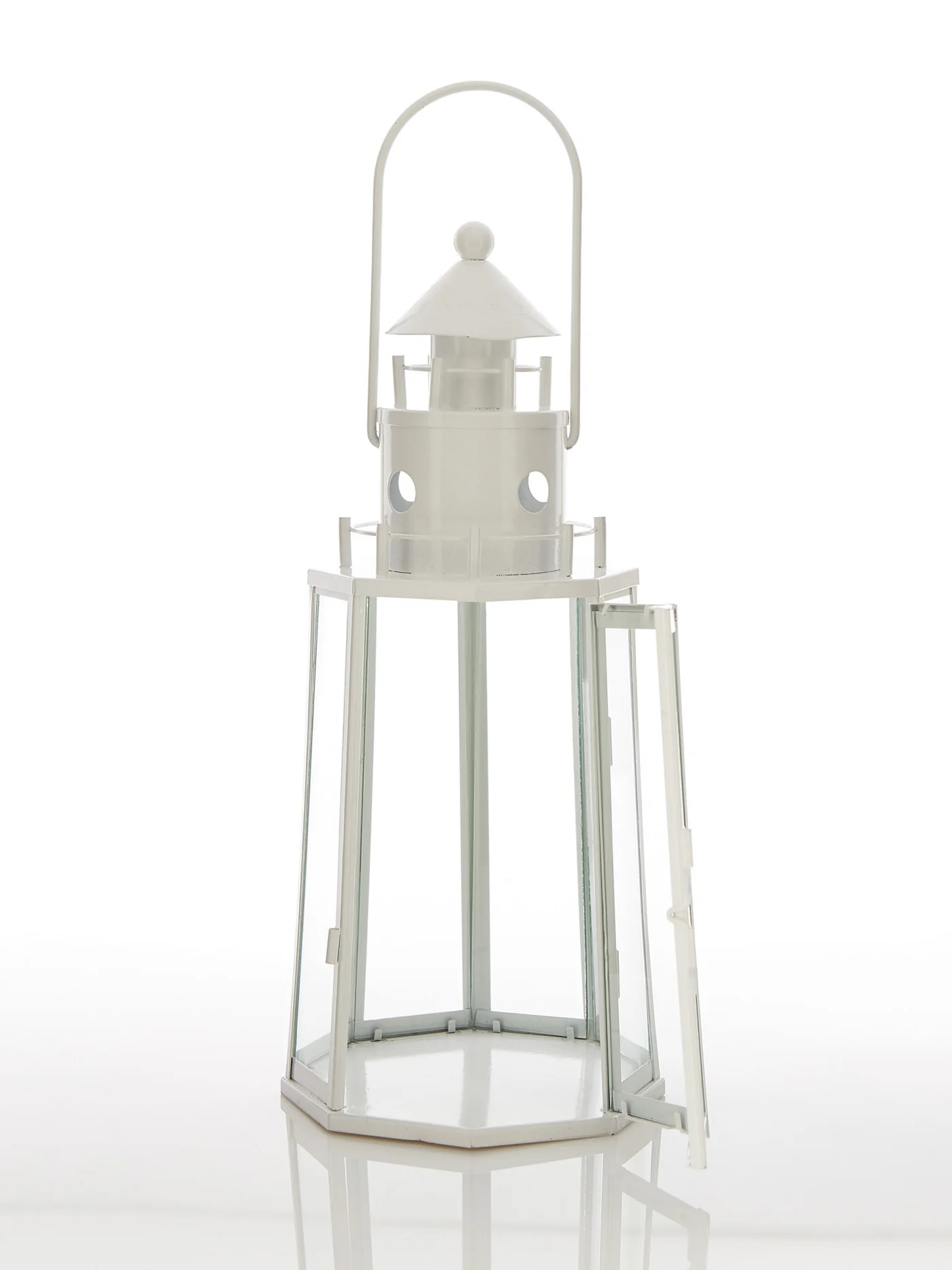 Decorate your home like a sleepy seaside village with this charming lighthouse lantern. With glass window panes, a contemporary galvanized metal top, and a metal handle for easy hanging this lantern is both sturdy and chic. Place a candle or LED of your choice inside the lantern to illuminate your space in a soft and serene glow. Use it to create a centerpiece for parties or special events, display on a countertop or coffee table, or to accent beach themed décor - available in a variety of styles and colors!
