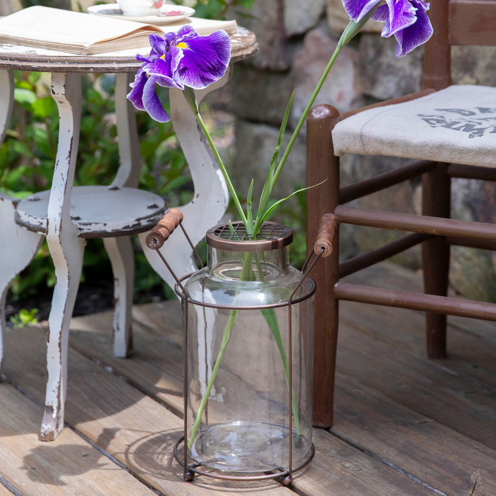 Bring a floral touch to a room with our Milk Can Flower Frog Vase. Grand in size, this vase makes a statement on a table and would create a beautiful bouquet. The glass milk can sits in an antique copper caddy with wood handles.