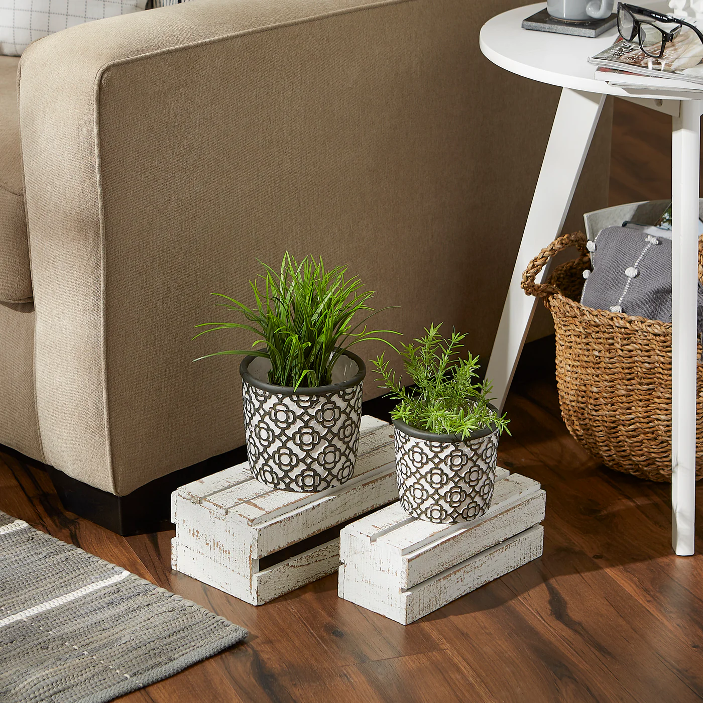 Enhance your garden or indoor space with this stylish set of two Dark Gray Lattice Cement Flower Pots. These modern and chic pots feature a unique lattice design that adds a touch of elegance to any space. Made from durable cement material, these pots are perfect for displaying your favorite plants and flowers. The dark gray color adds a sleek and sophisticated look to your decor. Whether you're looking to add a touch of nature to your home or spruce up your outdoor patio, these flower pots are the perfect choice. Don't miss out on this must-have set for your gardening needs!